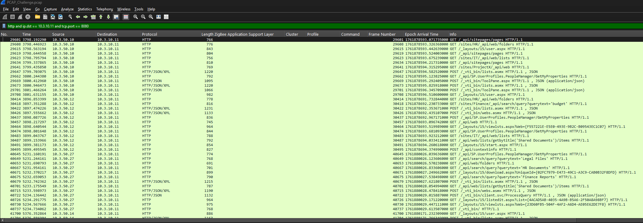 This filter quickly exposed several SharePoint-related endpoints, such as ToolPane.aspx and _layouts/15/start.aspx, confirming that the server was running SharePoint. With thousands of HTTP requests in play, manually reviewing each one was not practical, so a more strategic approach was required.