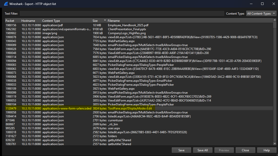 To cut through the noise, Wireshark → File → Export Objects → HTTP was used to extract all HTTP objects. These objects were then sorted by size, as exploit payloads are typically much larger than normal requests. Almost immediately, the ToolPane.aspx endpoint stood out as suspicious due to: