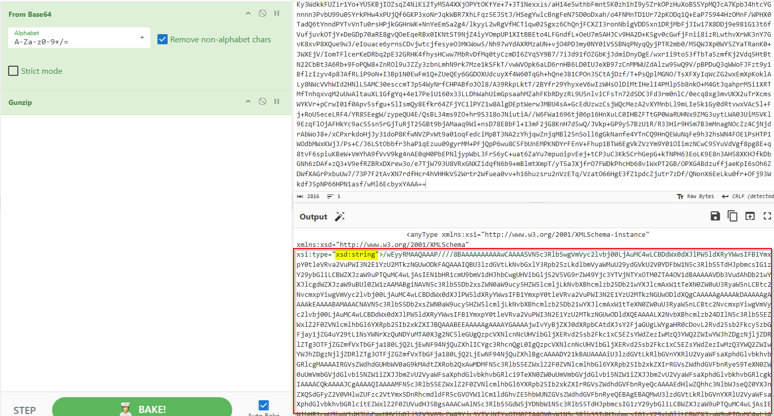 - Decompression Base64 decoding was applied, followed by GZIP decompression