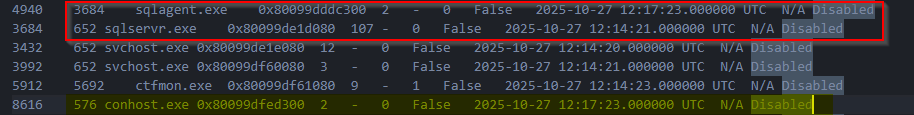 sqlagent.exe(PID 4940) running undersqlservr.exe, the legitimate Microsoft SQL Server service processconhost.exe(PID 8616) appearing alongside the SQL-related activity