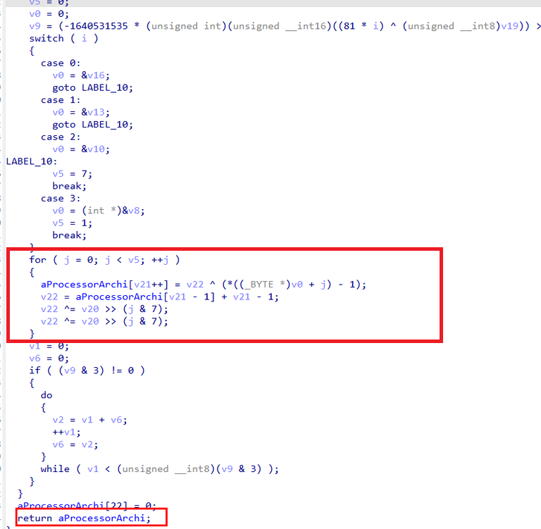 For the second part of the command line (v34), the code calls the function sub_2674B11010, which turns out to be a simple XOR decryption routine. This function decrypts an embedded value and stores the result in a variable named aProcessorArchi, which is then assigned to v34.