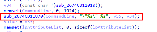 Digging deeper into the CommandLine variable showed that it is assembled inside the function sub_2674CB11870, which behaves similarly to sprintf_s. This function simply stitches together two values, v55 and v34, to form the final command line used when spawning the new process.