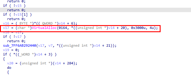 With dynamic clues exhausted, the focus shifted to static reverse engineering, starting with sqlagent.exe. Disassembly in IDA Pro showed that the binary acts as a reflective PE loader, designed to load encrypted executables directly into memory. The loader allocates memory using VirtualAlloc with MEM_COMMIT | MEM_RESERVE (0x3000u) and initial PAGE_READWRITE permissions (4u), a common technique used to stage payloads before changing memory permissions and executing them.