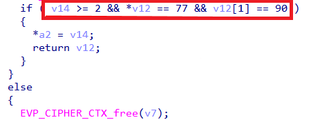After decryption, the function validates success by checking for the PE MZ header (0x4D5A). Once confirmed, the decrypted payload is returned and reflectively loaded into memory.