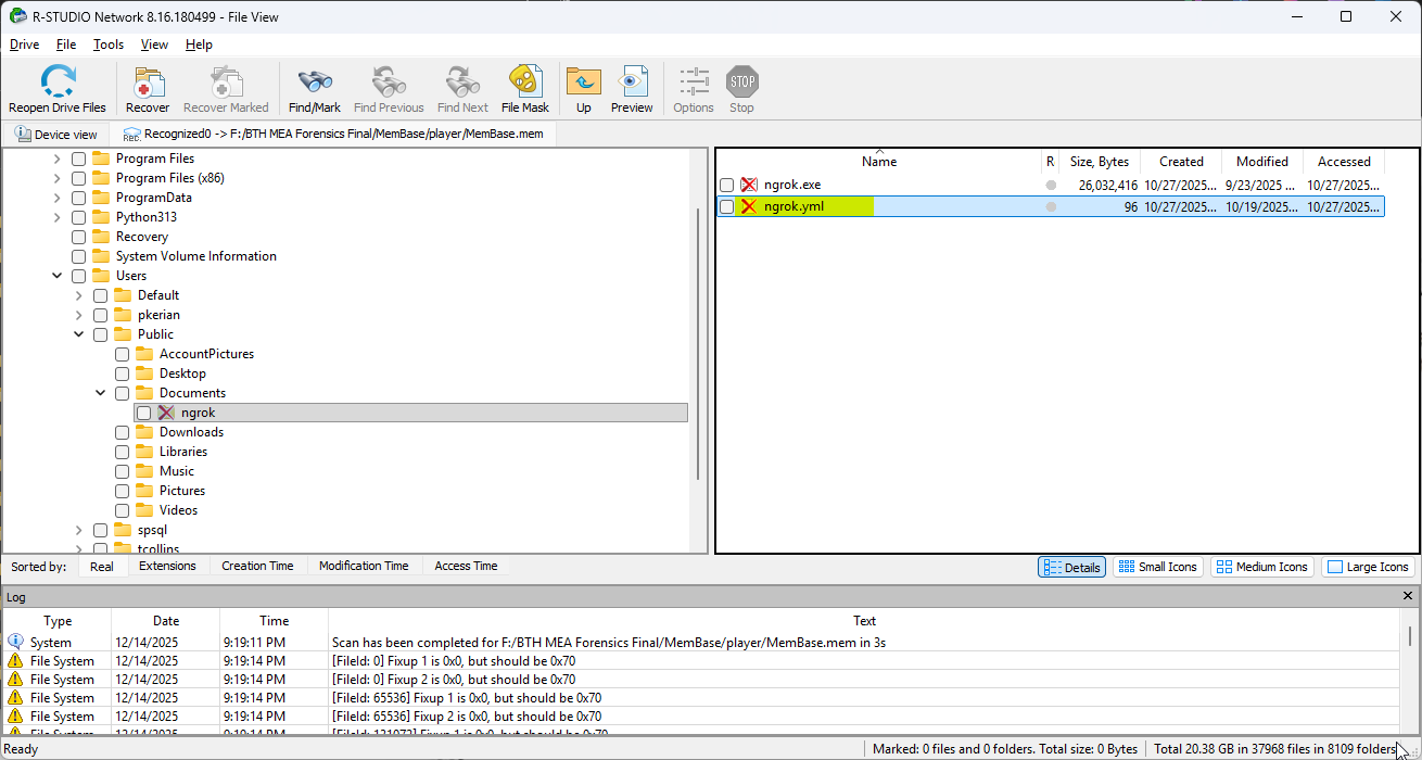 Since ngrok.yml was already present on disk, the next step was simply to grab it. Using R-Studio on the memory image, I navigated to the file system and successfully recovered the file from: C:\Users\Public\Documents\ngrok\ngrok.yml With the encrypted config now in hand, it was ready for offline decryption and further analysis.