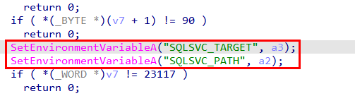 Tracing v55 back to its source revealed that it holds the value of the SQLSVC_PATH environment variable — the same variable that was previously set by sqlagent.exe. This confirms that the injected executable is reusing configuration data planted earlier in the attack chain, neatly tying the stages together.