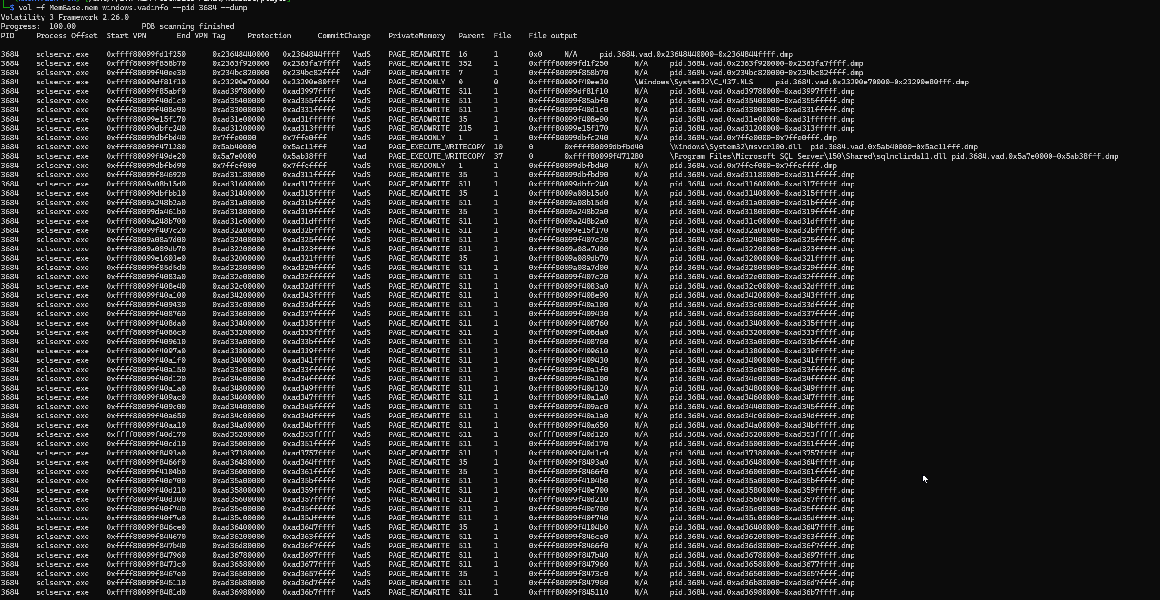 Jumping back into memory analysis, the vadinfo plugin was run again against sqlagent.exe. This time, the focus was on memory regions marked as PAGE_READWRITE, since any injected payload might still be lurking there before having its permissions upgraded. The goal was simple: hunt for anything that looked writable and suspicious before it tried to become executable.